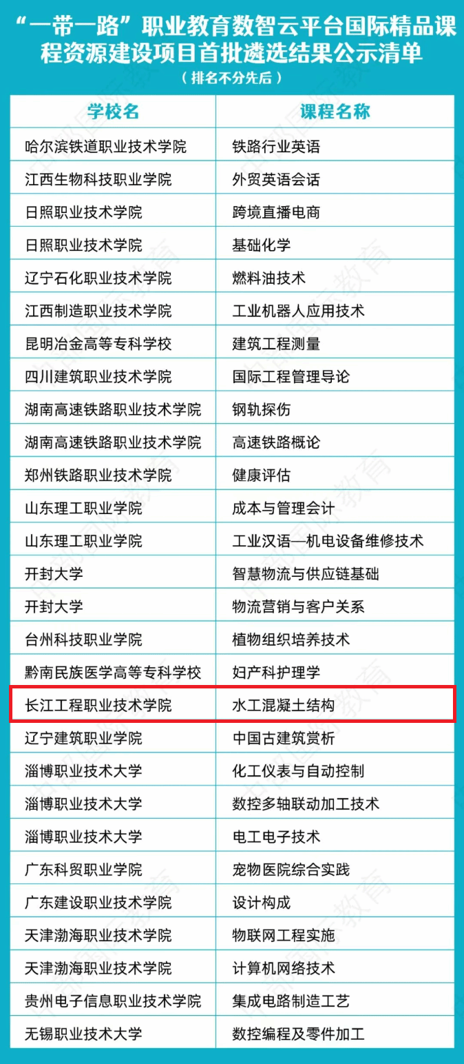 此次评选竞争激烈,除我校课程外,还有十余所国家级、省级“双高计划”院校的课程也同期入选,覆盖铁路工程、智能制造、健康护理等国家战略重点领域。我校《水工混凝土结构》课程凭借精准锚定“一带一路”共建国家基础设施建设对水利水电专业人才的迫切需求,充分彰显了学校水利水电专业群深耕职业教育的深厚积淀与鲜明特色。