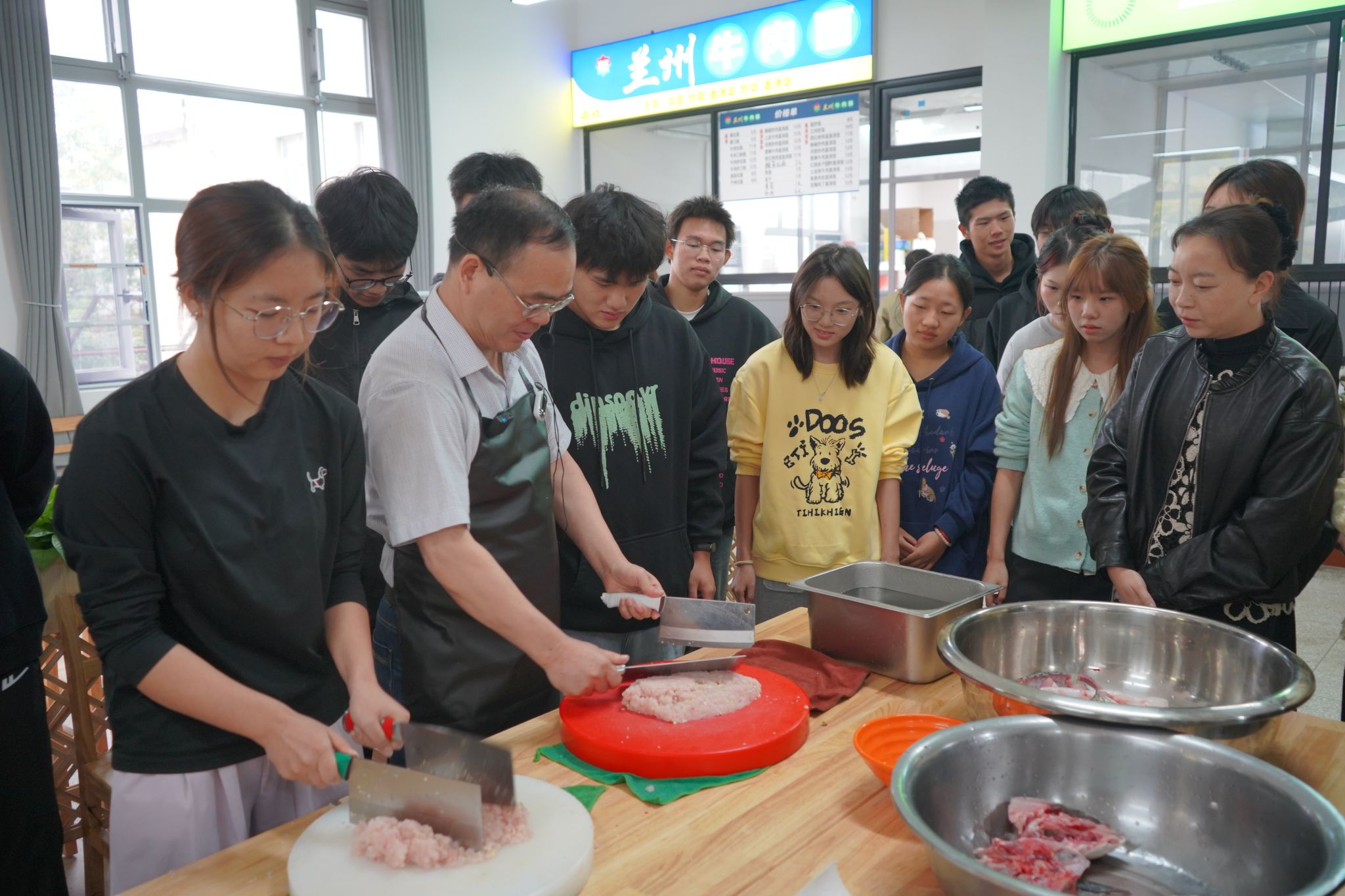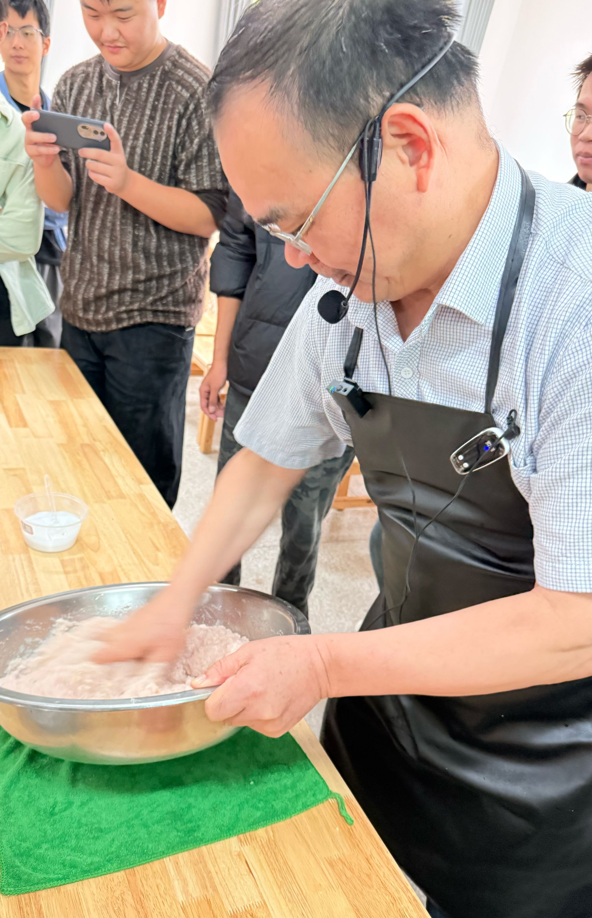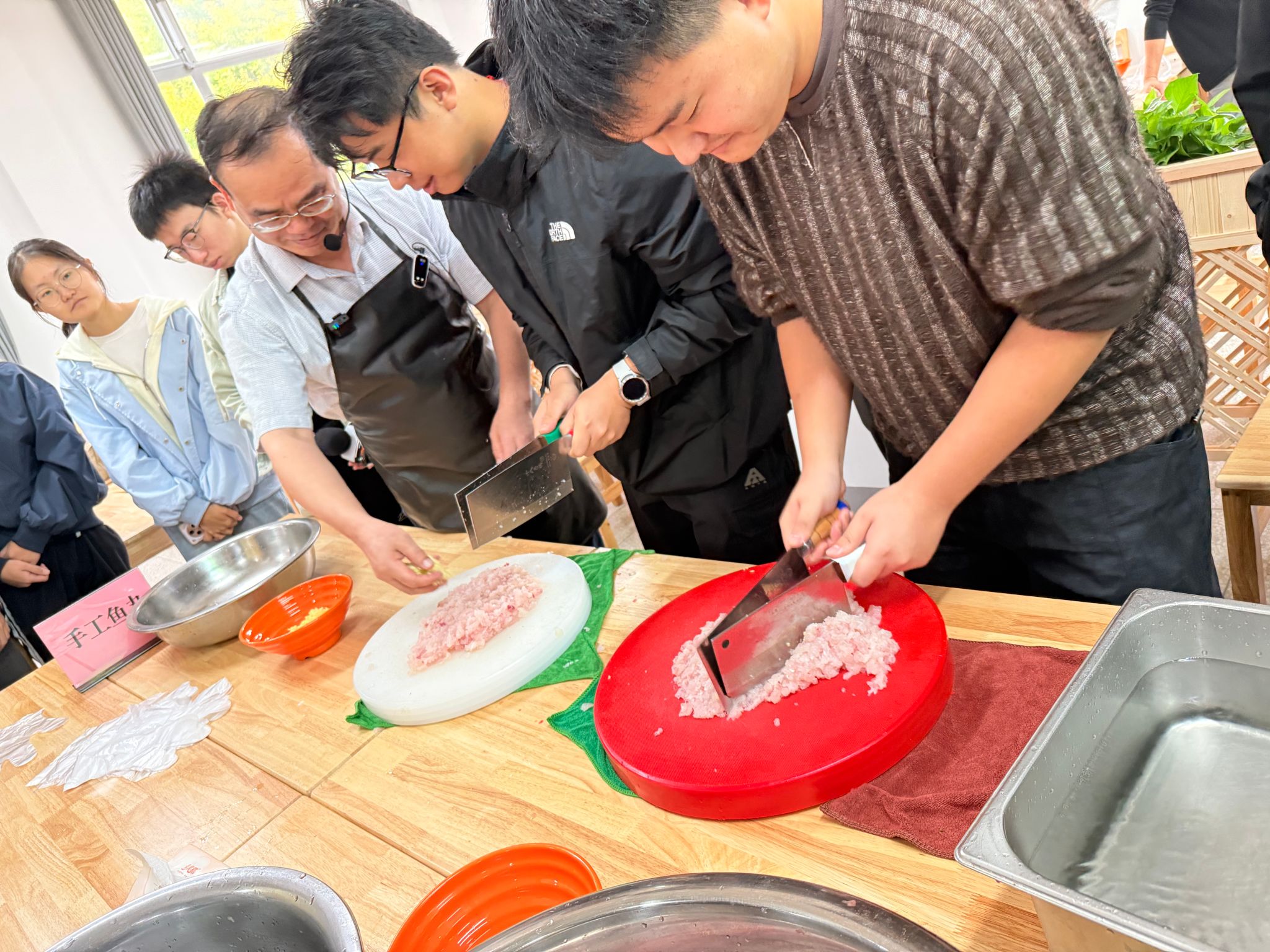 家宴现场,向家文身着围裙,亲手教授同学们制作湖北特色菜肴——手工鱼丸。只见他一边处理鱼肉,一边仔细给同学们讲解这道菜的注意事项和技巧。现场同学们被他精湛的刀工、耐心的教导深深吸引,鱼丸也在“千锤百炼”逐渐成型,成为餐桌上最受欢迎的菜品。