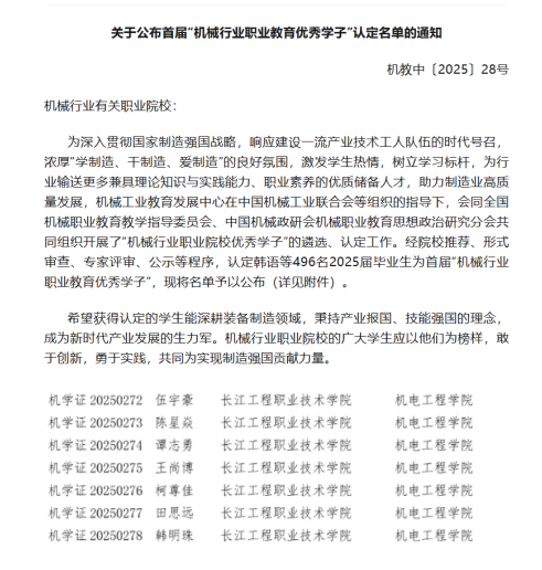 此次“机械行业职业教育优秀学子”认定活动,旨在选拔职业教育领域践行“技能成才、技能报国”理念的杰出学子,树立职业教育人才培养的先进典型,为机械行业的高质量发展储备优秀后备力量。评选标准涵盖专业学习成绩、职业技能水平、实践创新成果、综合素质表现等多个维度,经过院校推荐、资格审核、专家评审等多轮严格遴选,最终确定认定名单。长江工程职业技术学院的7名机电学子成功入选,彰显了该校在同类院校中的综合竞争力。