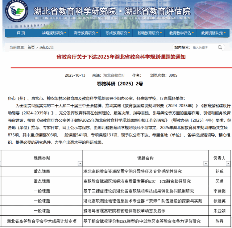 10月13日,湖北省教育厅公布了2025年湖北省教育科学规划课题立项结果,我校立项重点课题2项、一般课题3项、专项课题1项,立项数首次突破6项,这也是我校文科继“2023年省教育厅哲社研究项目立项数(7项)居全省第...