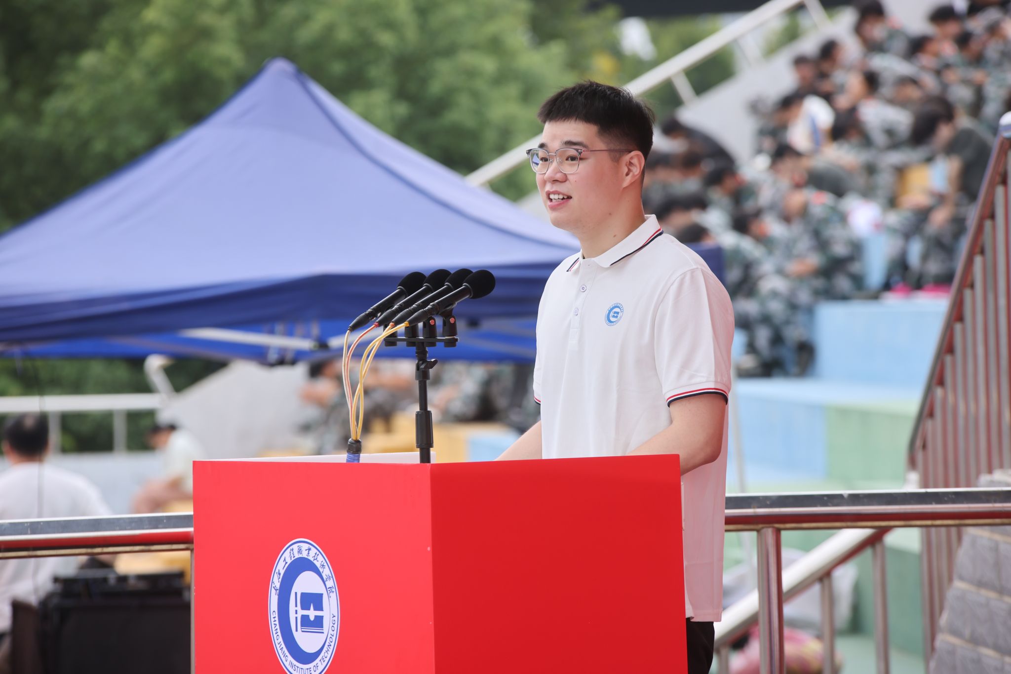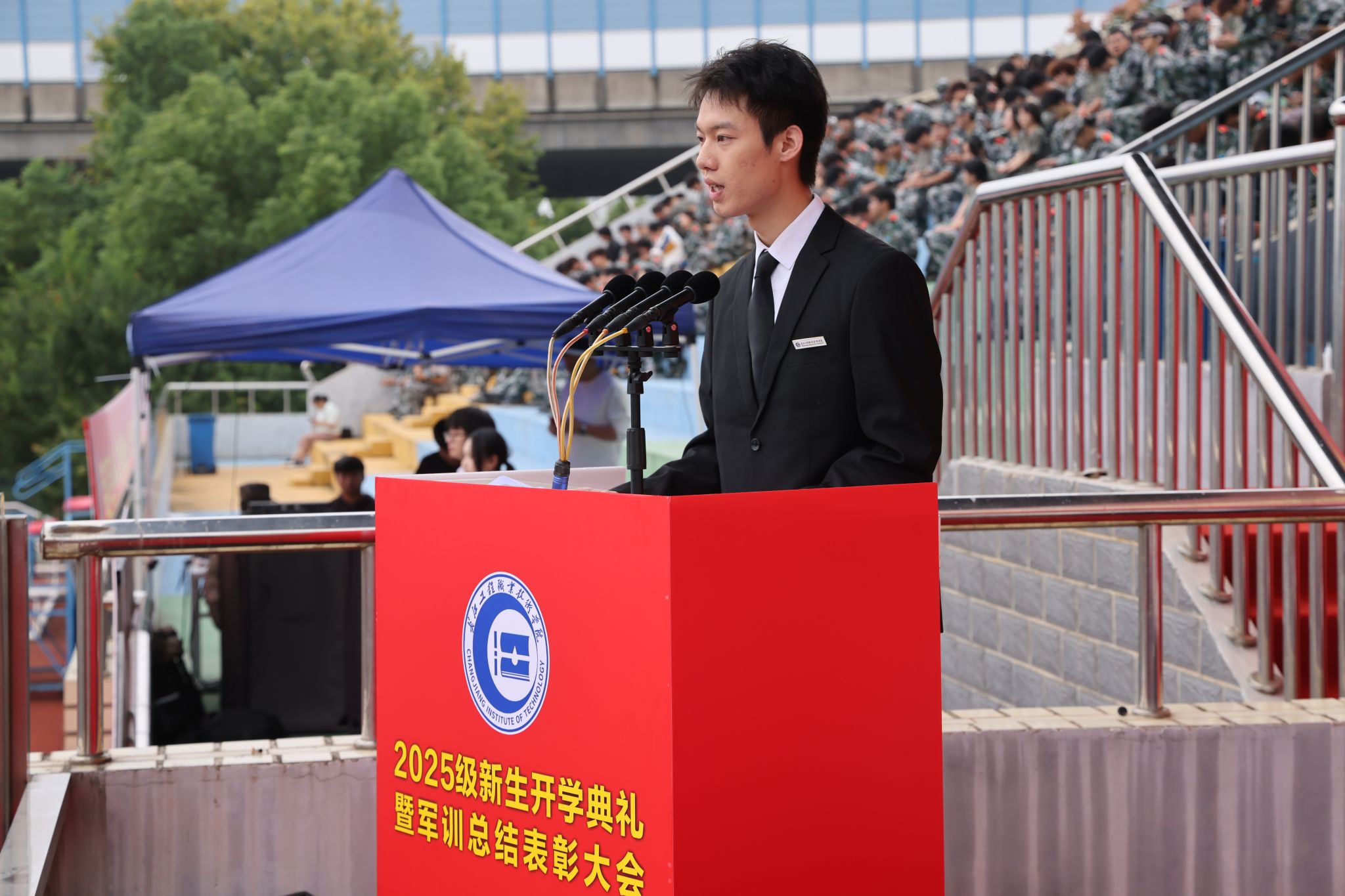 大会分为开学典礼与军训会操总结表彰两个阶段,由校党委委员、副校长卢俊主持。在庄严的国歌声中,五星红旗冉冉升起,全体人员肃立致敬,拉开了大会的序幕。开学典礼上,在校生代表、城市建设学院道桥2302班杨俊哲同学率先发言。作为2024年度国家奖学金获得者与2025年世界职业院校技能大赛金奖得主,他分享了自己在专业学习与技能竞赛中的成长感悟,鼓励新生以青春赴使命,以技能筑梦想。随后,水利水电学院黄宏亮副教授作为教师代表寄语新生,希望同学们深耕专业、精进技能,在师者引路下书写成长答卷。奥的斯电梯(中国)有限公司武汉分公司总经理周晶晶先生代表合作企业发言,他结合行业发展需求,表达了对校企协同培育技术技能人才的期待与支持。