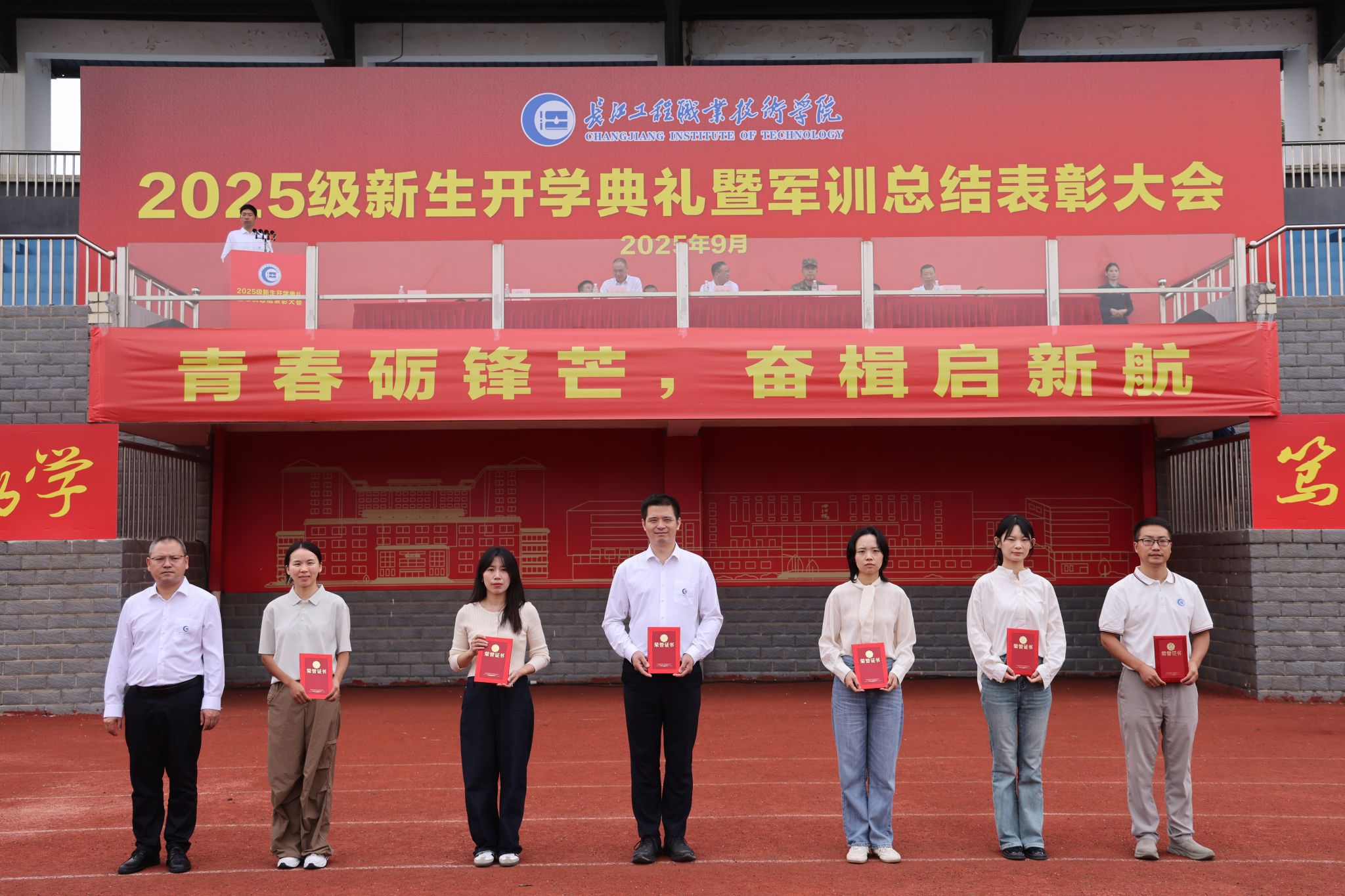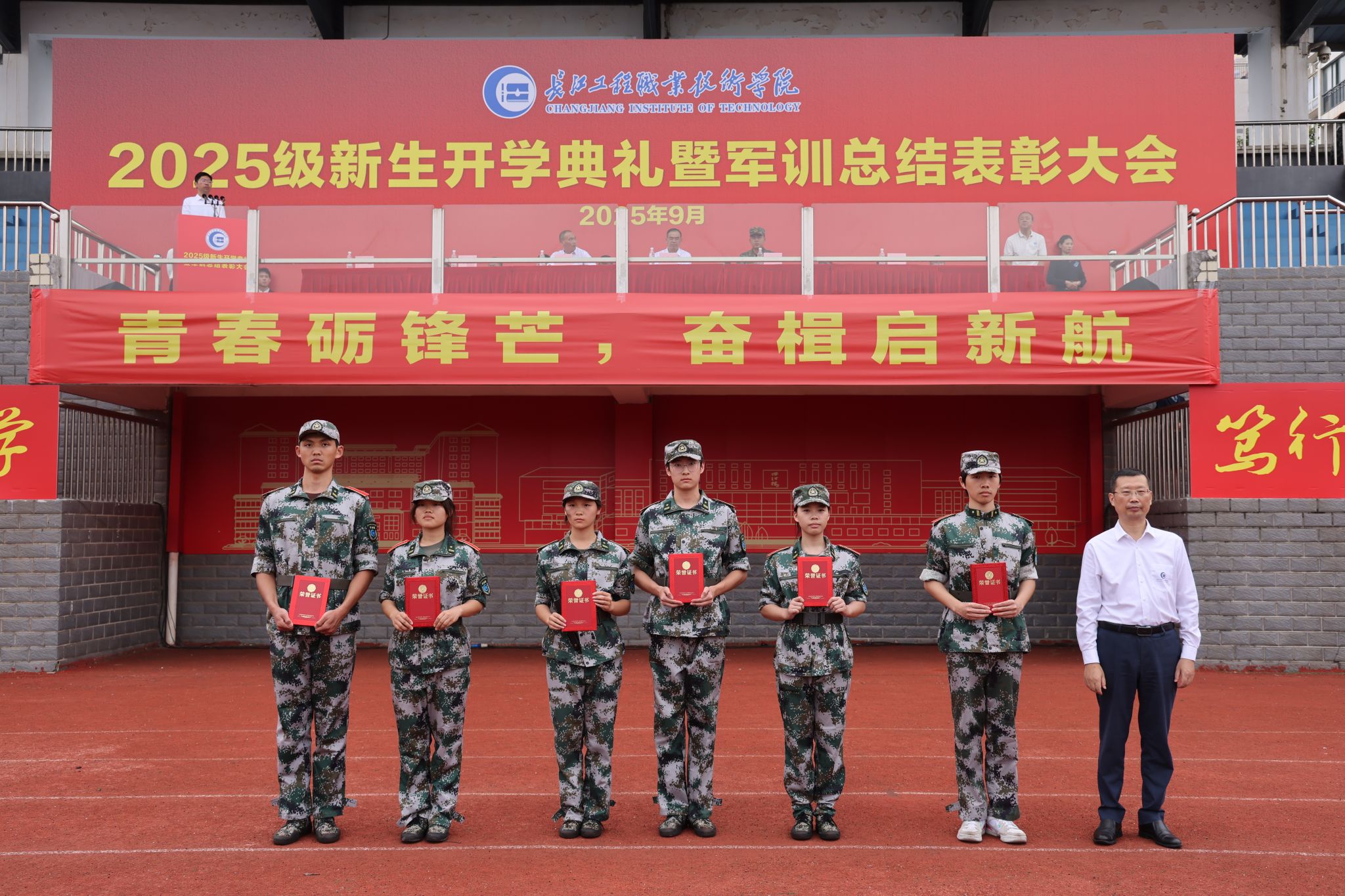 优秀校友代表的分享则带来了跨越时空的激励。计算机应用技术专业2021届毕业生高浩祥、会计电算化专业2018届毕业生彭中彭分别回顾了在校时光,讲述了从校园到职场的奋斗历程,勉励学弟学妹们珍惜平台、锤炼本领,传承学校“艰苦奋斗、忠诚质朴”的精神基因。2025级新生代表、测绘信息工程系王俊峰同学在发言中表态,将以军训为起点,以学长为榜样,在大学三年中笃学实干、不负韶华。发言结束后,校长杨道远为王俊峰同学佩戴校徽,象征着2025级新生正式成为“长江工院人”。
