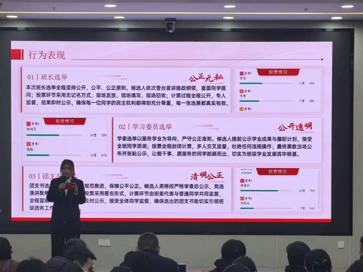 评选紧扣清廉文化建设要求,围绕思想引领、制度保障、文化氛围、行为规范四个维度展开。各班通过PPT展示,结合案例与数据,生动汇报了廉洁教育实践成效。评委团依据建设实效、材料完整性和现场表现进行综合评定。