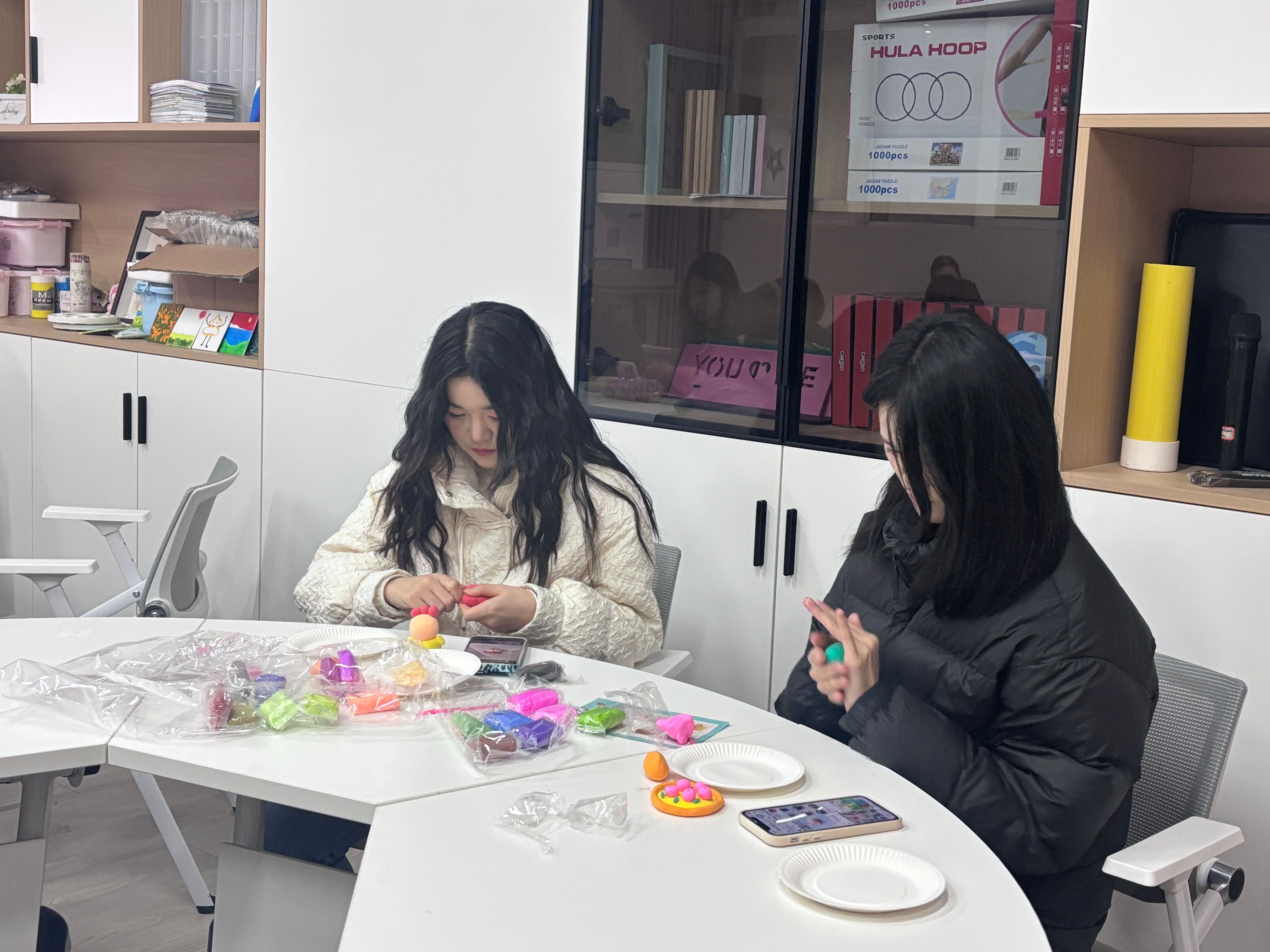 活动现场,工作人员提前准备好各色黏土、纸盘等材料,营造出温馨舒适的创作氛围。活动开始后,大家先观看了教学视频,学习黏土揉捏、色彩混合的基础技法,随后便开启自由创作模式。指尖翻飞间,一团团普通的黏土被赋予生命力,或化作憨态可掬的小动物,或变成色彩斑斓的风景,或呈现出充满巧思的抽象造型。同学们一边专注创作,一边分享彼此的灵感与趣事,欢声笑语回荡在团辅室内。