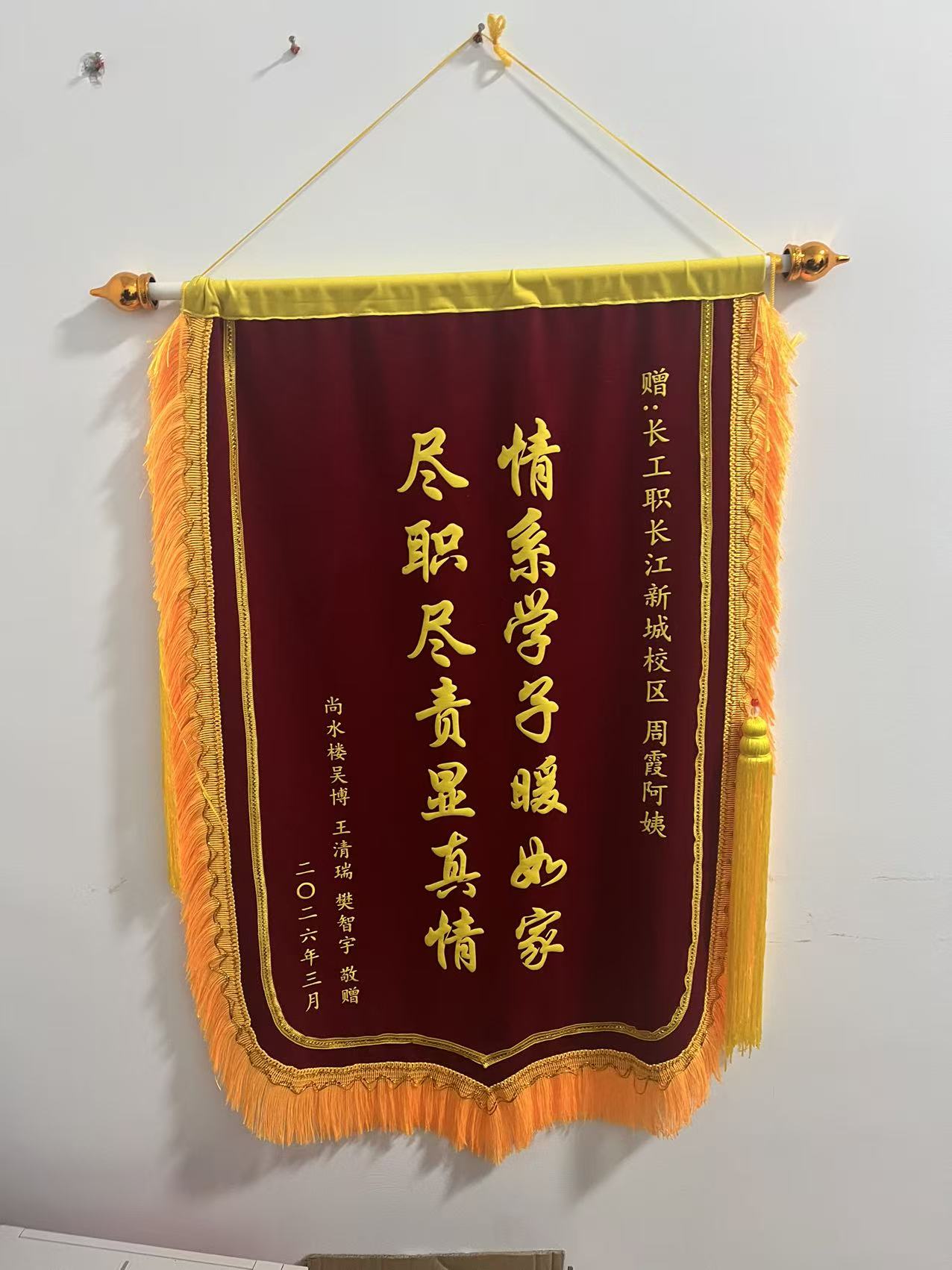 近日,长江新城校区尚水楼宿管员周霞同志收到了一份特殊的礼物——一面写有“情系学子暖如家,尽职尽责显真情”的锦旗。这面锦旗由尚水楼水利水电学院和北斗技术学院的学生们自发赠送,以此表达对周霞同志长期以来默默付出、关爱学生的由衷感谢。