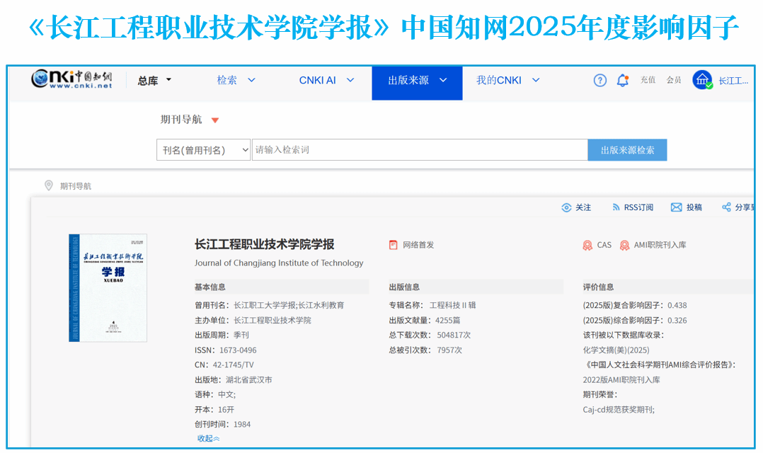 中国知网的最新统计数据显示,《长江工程职业技术学院学报》2025年度复合影响因子升至0.438,综合影响因子升至0.326,在湖北省14家高职高成学报中均名列第三,实现学报创刊以来的最好位次。为提高学报质量,自202...